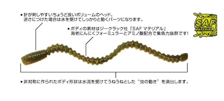 Ajing avlarında, bu yemin ince silueti ve doğal kıvrımları, özellikle geceleri veya düşük ışık koşullarında balıkların ilgisini tetikler. Mikro hareketlere duyarlı balıklar için oldukça ideal bir sunum imkanı sağlar.